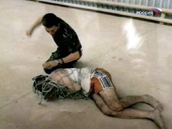 Издевательства над арестованным иракцем. Фотография, показанная в эфире телеканала "Россия"