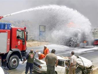 Ливанские пожарные тушат разбомбленную автоколонну в Бейруте. Фото AFP
