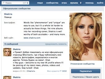 Представительство Шакиры представляет собой не личную страницу, как это сделано у ряда российских исполнителей и популярных персон, а сообщество. Первые записи на странице певицы датированы 15 октября, а восьмого ноября появилось приветствие на русском и английском языках.