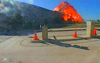 Две камеры видеонаблюдения, расположенные на парковке Пентагона, зарегистрировали падение самолета рейса 77 компании American Airlines на юго-западное крыло военного штаба США. Хотя продолжительность видефрагментов составляет около двух минут, самолет появляется в них на долю секунд, после чего изображение сменяется огромным огненным шаром и клубами дыма, который начинает валить из здания.