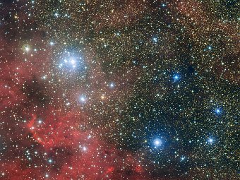 Изображение было получено в обсерватории Ла-Силла в Чили с помощью двухметрового телескопа, снабженного камерой широкого поля. На фотографии видны яркие молодые бело-голубые звезды, окруженные облаком межзвездного газа.