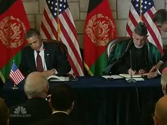 Обама и Карзай подписывают договор о стратегическом партнерстве. Кадр NBC News