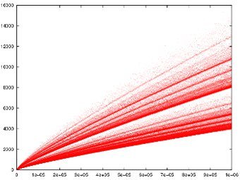 По горизонтали откладываются четные числа до миллиона, а по вертикали - количество представлений этих чисел в виде суммы двух простых. Иллюстрация Glivi/Wikipedia