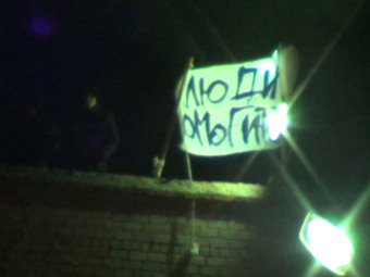 Плакаты с надписями вроде "Люди помогите!" видны на видео РИА Новости с места беспорядков - они вывешены из окон захваченной заключенными вышки на территории колонии.