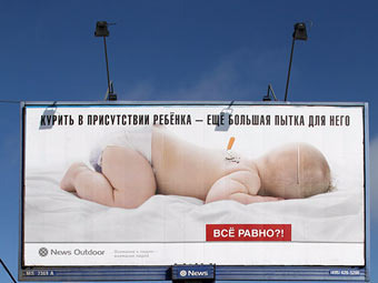В качестве примера Макаров привел антитабачную кампанию "Все равно?" оператора наружной рекламы News Outdoor. В Москве весной 2010 года компания разместила плакаты с изображением младенца, о спину которого была затушена сигарета. В марте Федеральная антимонопольная служба признала, что данная реклама наносит вред здоровью и развитию детей, и запретила ее.