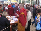 "Буддизм говорит, что мы способны избавиться от омрачений (ума - Прим. ред.), которые продолжаются лишь до тех пор, пока мы не достигнем состояния будды", - заключил Далай-лама. На время учений Дхарамсала частично стала "русским городом" На время учений для россиян Дхарамсала частично стала "русским городом" - на узких гористых улочках, где толпы пешеходов смешиваются с постоянно гудящими машинами и непринужденно бродящими коровами, повсюду слышна русская речь. Даже продавцы лавок начали говорить по-русски (благо, учения проводятся не первый год и, очевидно, не последний). Чтобы занять место в главном храме Дхарамсалы Цуглакан, паломники приходят рано утром, за несколько часов до учений, к началу которых в самом храме и во дворе перед ним уже в буквальном смысле "яблоку негде упасть". Перед входом на обширную территорию храма все традиционно проходят строгую проверку: помимо металлоискателей, это еще и обыск, поэтому длинную очередь верующих заблаговременно делят на мужскую и женскую части. Запрещено проносить с собой мобильные телефоны, фото- и видеоаппаратуру, компьютеры и, конечно же, оружие. При входе в храм буддисты снимают обувь и плотно рассаживаются рядами на полу (на матах, подушках, "пенках" и ковриках). При этом стараются утеплиться, поскольку помещения не отапливаются, а многочисленные окна открыты настежь. Утешением зачастую страдающему телу паломника во время многочасовых учений служат разносимые тибетскими монахами лепешки и тибетский чай, готовящийся по особому рецепту - с молоком, маслом и солью. Во время обеденного перерыва во дворе храма тысячам слушателей также бесплатно раздают еду - бананы, рис, дал (подливка из чечевицы с овощами и зеленью). Паломники проявляют дружелюбие и взаимопомощь, беспрепятственно находя общий язык (чаще всего английский, тибетский или русский). Далай-лама говорит на тибетском, его слова синхронно переводятся на английский, а затем на русский и еще несколько языков (включая испанский, итальянский) и транслируются в интернете на русскоязычных сайтах dalailama.ru и savetibet.ru. Программа учений Далай-ламы для россиян включает "посвящение Чакрасамвары" (Чакрасамвара - божество, считающееся проявлением будды невозмутимого спокойствия), комментарии к философским трактатам буддизма (текстам Чже Цонкапы "Счастливая судьба" и геше Лангри Тангпы "Восемь строф о тренировке ума"), ответы Далай-ламы на вопросы россиян и дополнительные лекции признанных буддийских учителей. Несколько лет назад духовный руководитель фонда "Сохраним Тибет", Верховный лама Калмыкии Тэло Тулку Ринпоче и лама Бурятии Ело Ринпоче обратились к Далай-ламе от имени российских буддистов с просьбой "даровать" специальные учения. "Согласно нашему первоначальному плану, учения должны были продолжаться на протяжении трех лет, ведь мы попросили даровать посвящения в тантры трех йидамов (божеств. - Прим. Ред.): Ямантаки (2009), Гухьясамаджи (2010) и Чакрасамвары (2011)", - отметил Тэло Тулку Ринпоче. В первом, 2009 году, из России приехало свыше 800 паломников. На следующий год учения Далай-ламы в Дхарамсале посетили уже более 1200 человек из России и СНГ, а общее число участников превысило 5 тысяч. На подобных учениях Далай-лама обращается, прежде всего, к тем ученикам, которые выступили инициаторами учений, но слушателями могут становиться все желающие б