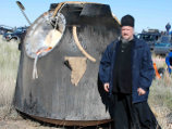 Епископ Севастиан приветствовал вернувшихся членов космической экспедиции, а затем сфотографировался вместе с ними и рядом со спускаемым аппаратом.