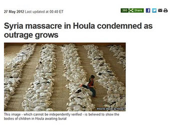 Новость под заголовком "Бойню в Хуле осудили, недовольство в народе растет" была опубликована на сайте BBC News 27 мая. На иллюстрации к новости маленький мальчик прыгал среди десятков трупов, завернутых в белые мешки. Редакция сайта добавила, что снимок был сделан в Хуле неизвестным активистом и что его достоверность пока нельзя подтвердить.
