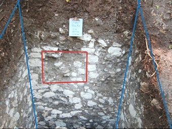 Раскопки плотины в Тикале. Красным квадратом выделен шлюз. Фото University of Cincinnati